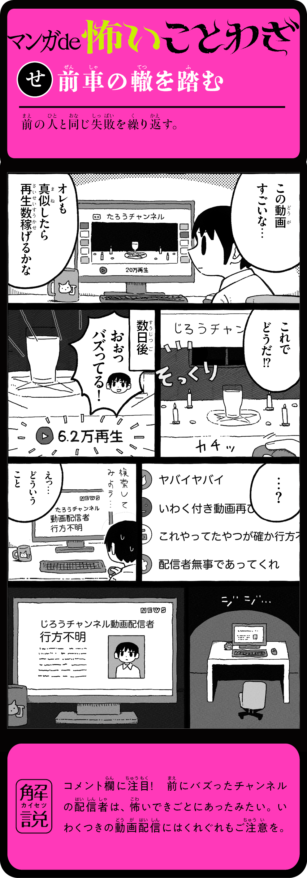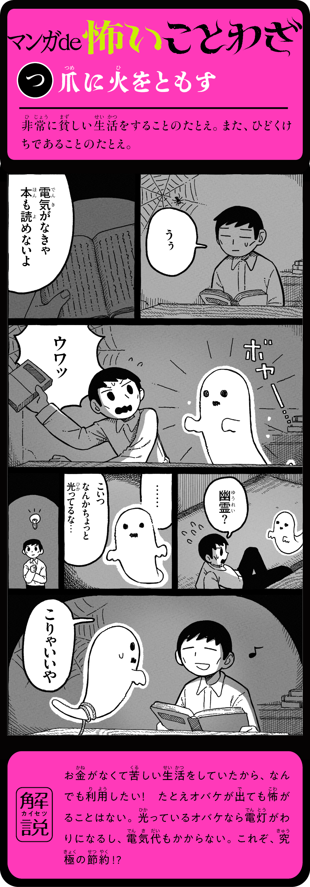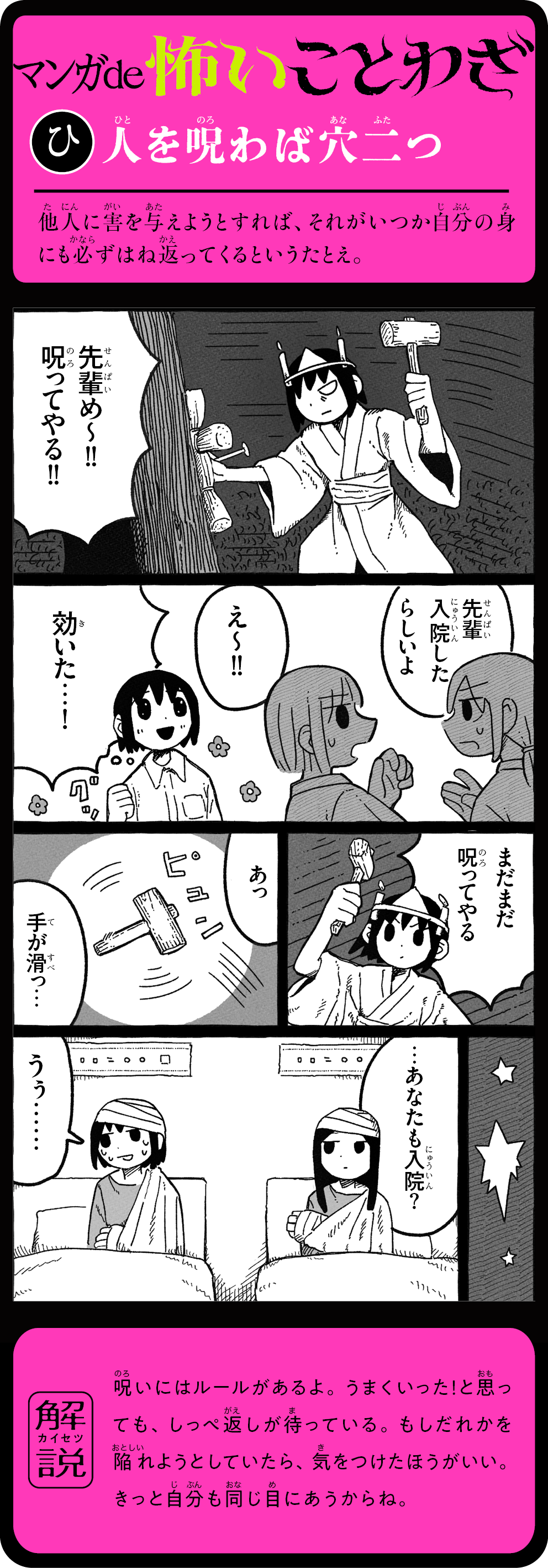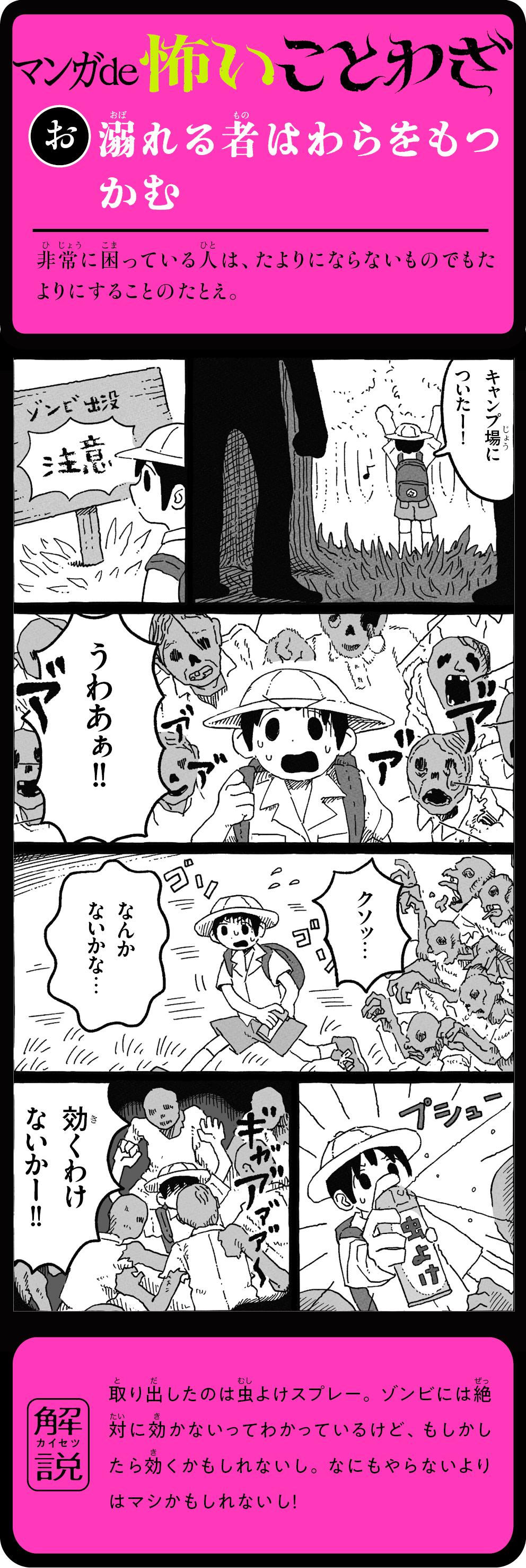 そのことわざ、本当はこんなに怖かった! 怖い話を読むうちに、ことわざの意味が自然と頭に残る! 1話5分で読めて、ためになる。知らないことわざも楽しく身につく、新感覚よみもの。ことわざホラー短編16話+ことわざホラーマンガ12話を収録。