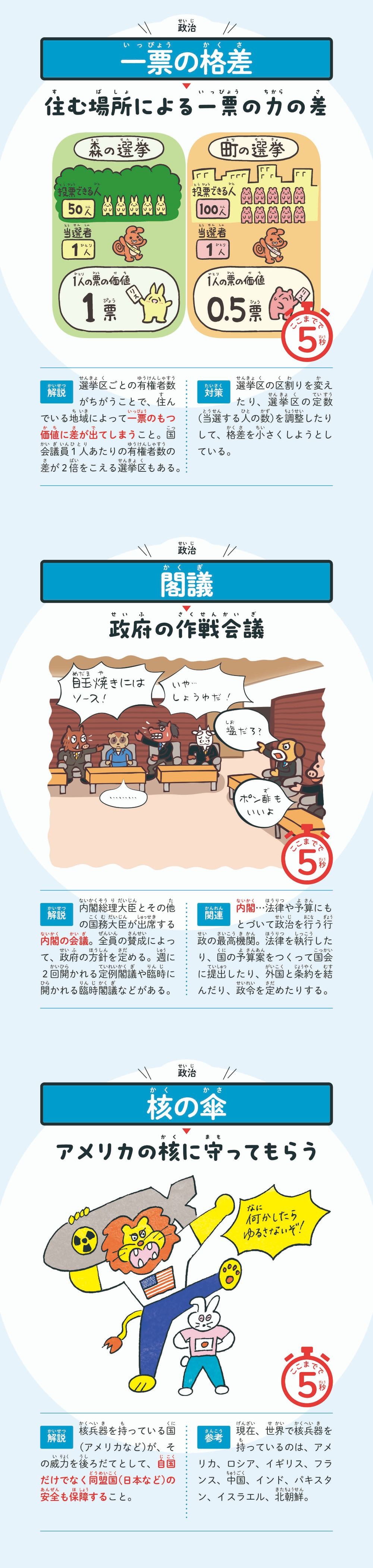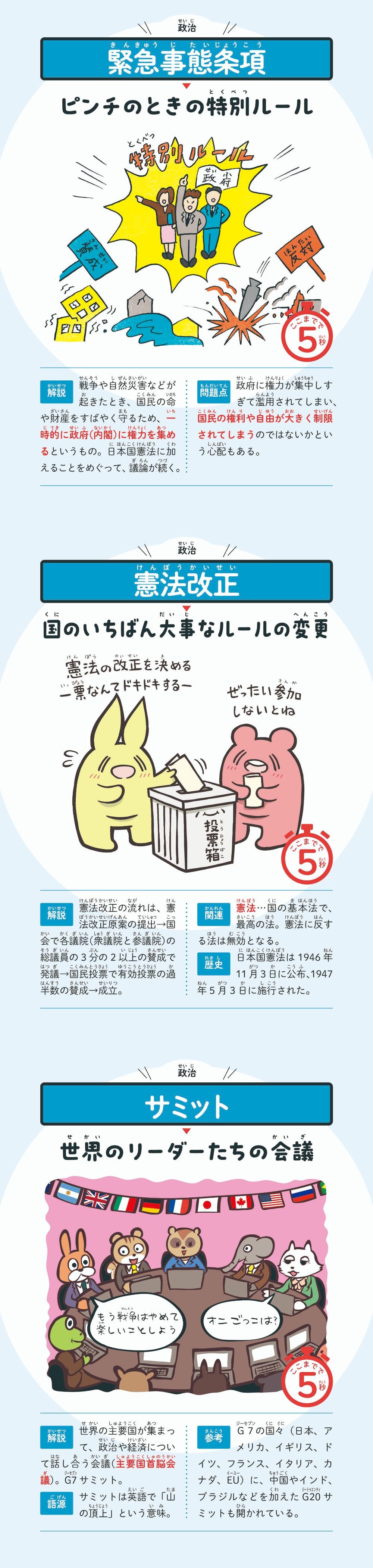 簡潔な言いかえとひと目でわかるイラストで、時事用語、社会科用語が楽しく学べる本。タイパ最強!1語につきたった5秒なので、読書や勉強が苦手な方や、さくっと学び直したい方にもおすすめ。かわいくてわかりやすいイラストで、バッチリ記憶に残る。