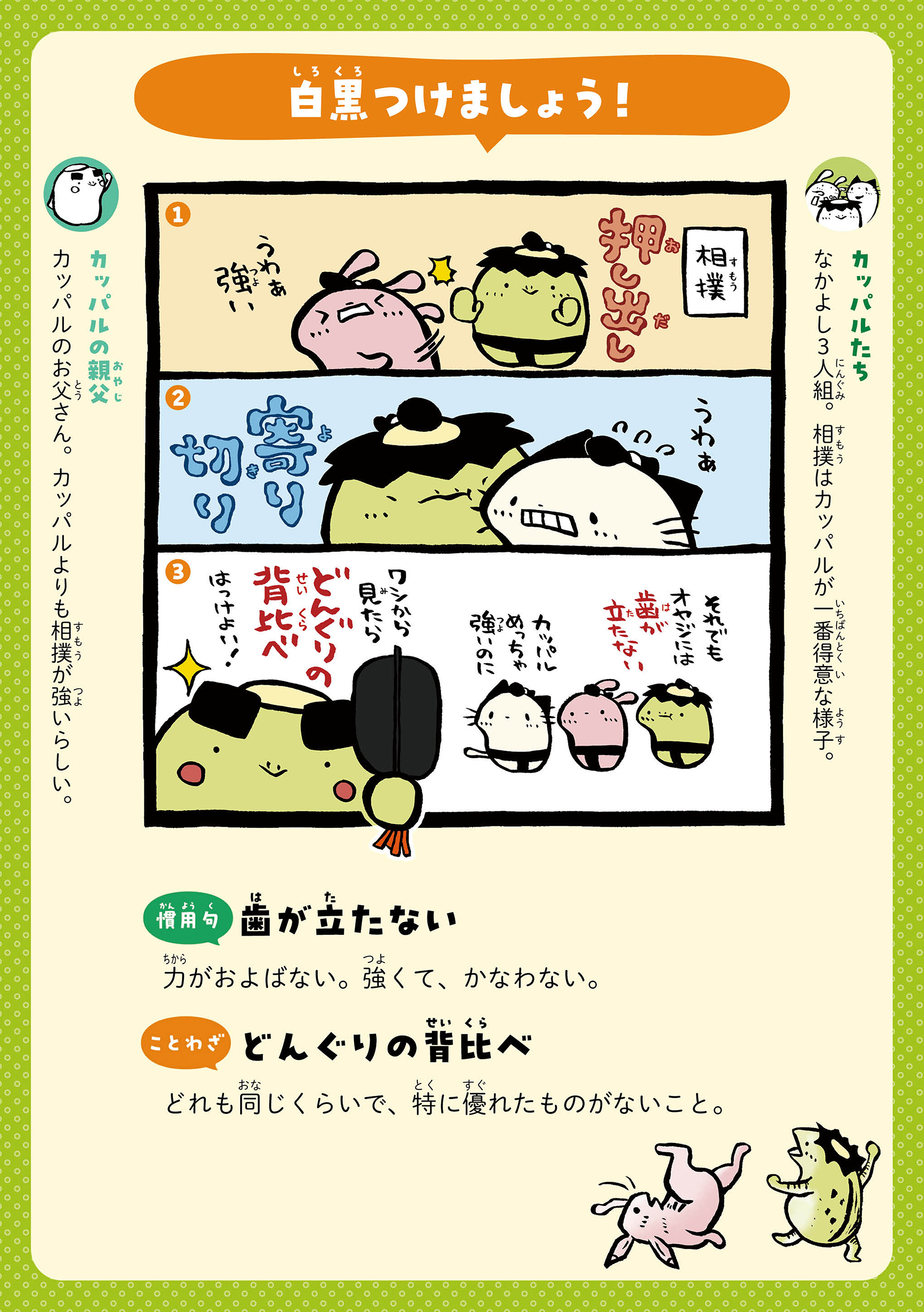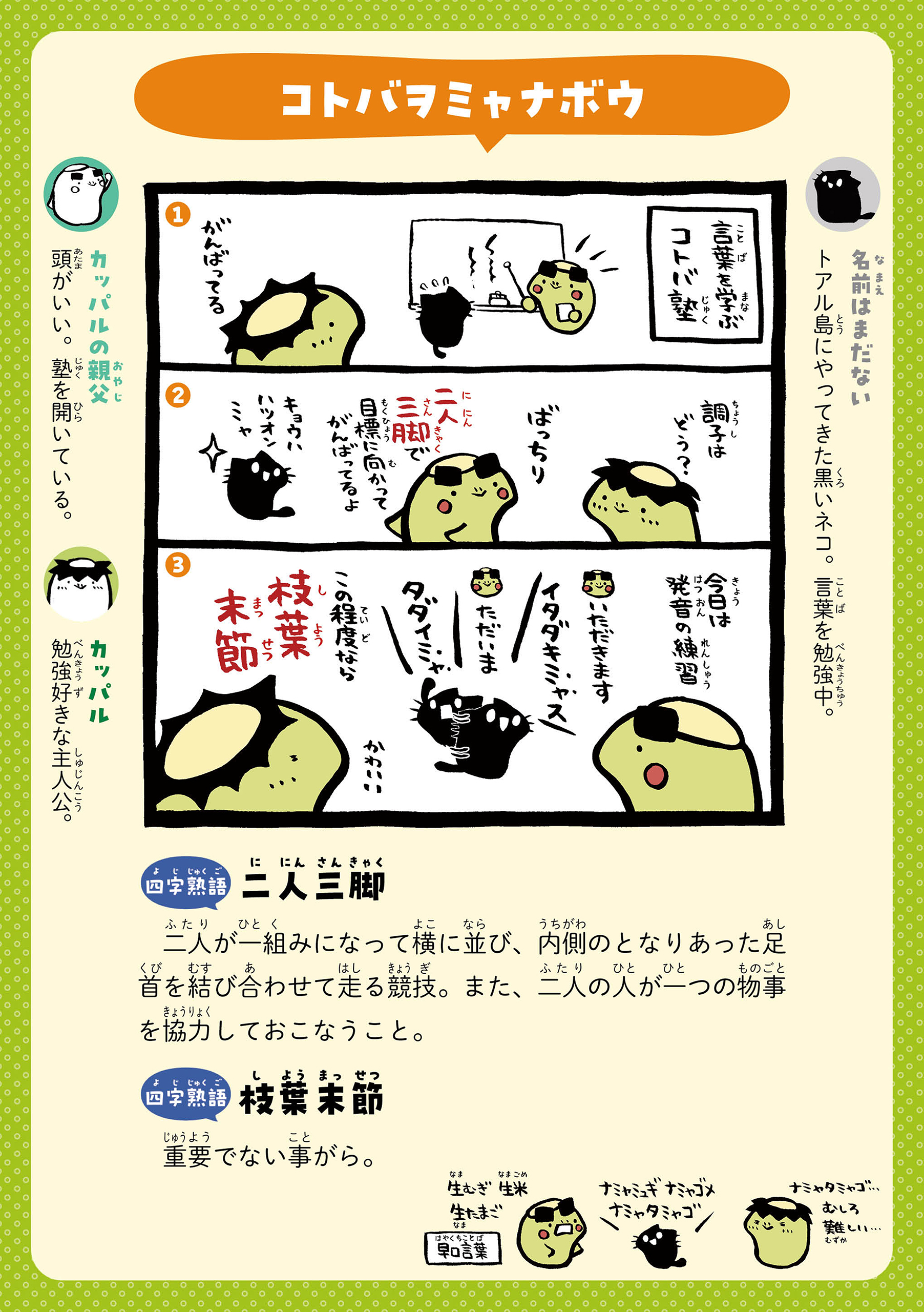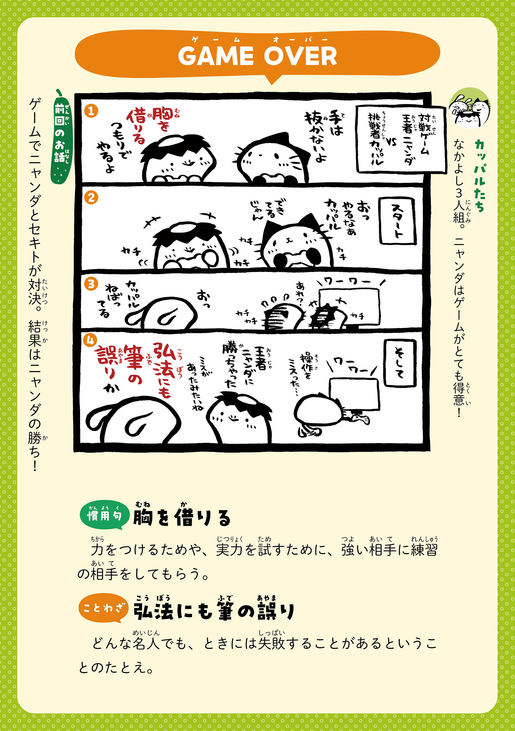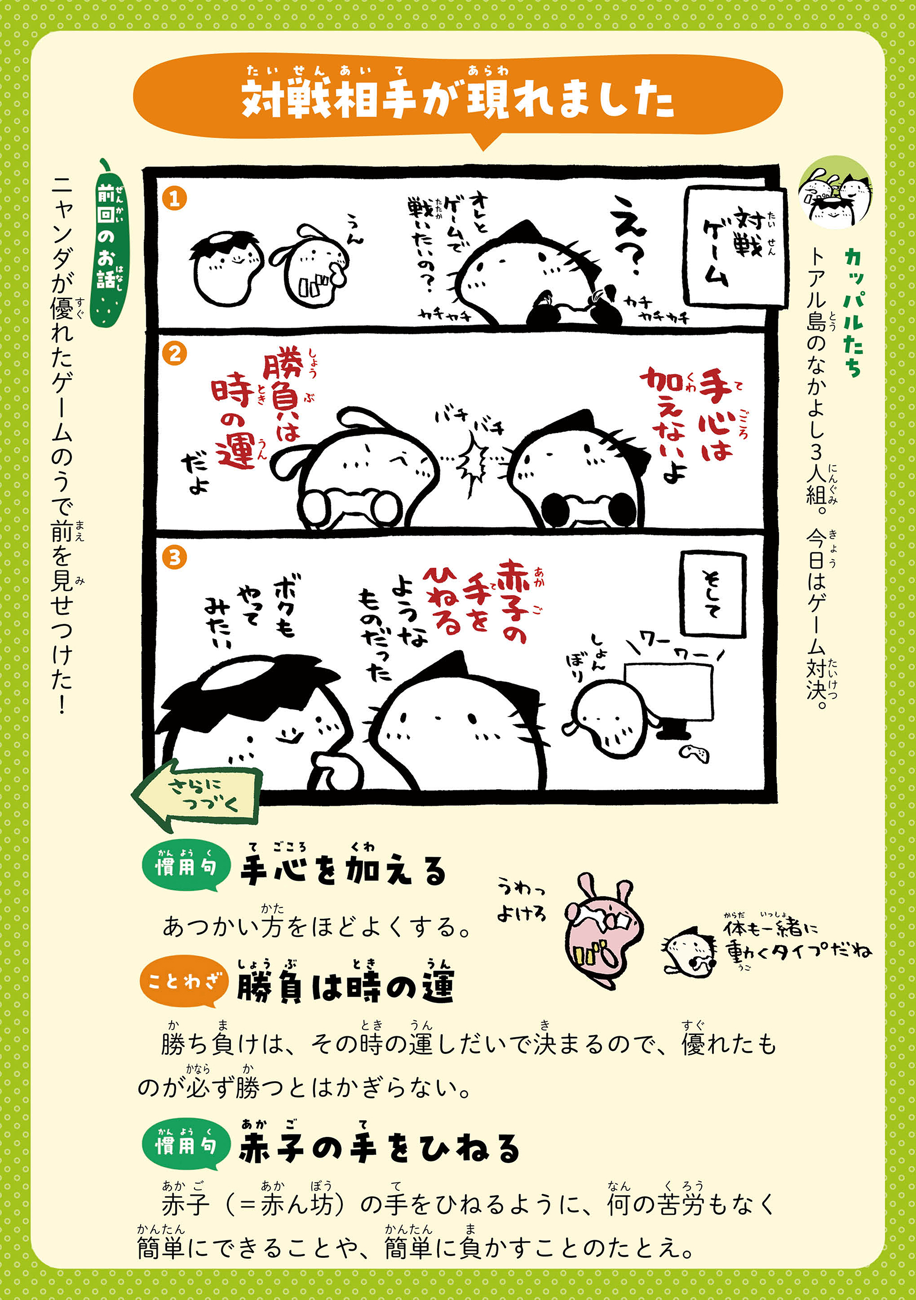 カッパルたちとことばであそぼう! 主人公のカッパの男の子・カッパルと個性的な仲間たちの日常を通して、ことわざや慣用句などの言葉を楽しく学べる連載です。毎週月・木に更新! 書籍『まんがでことわざ・慣用句 カッパルとことばであそぼう』好評発売中! https://hon.gakken.jp/book/1020609800 参考書籍:「新レインボー小学ことわざ・四字熟語辞典 改訂第2版 (オールカラー)」(Gakken)