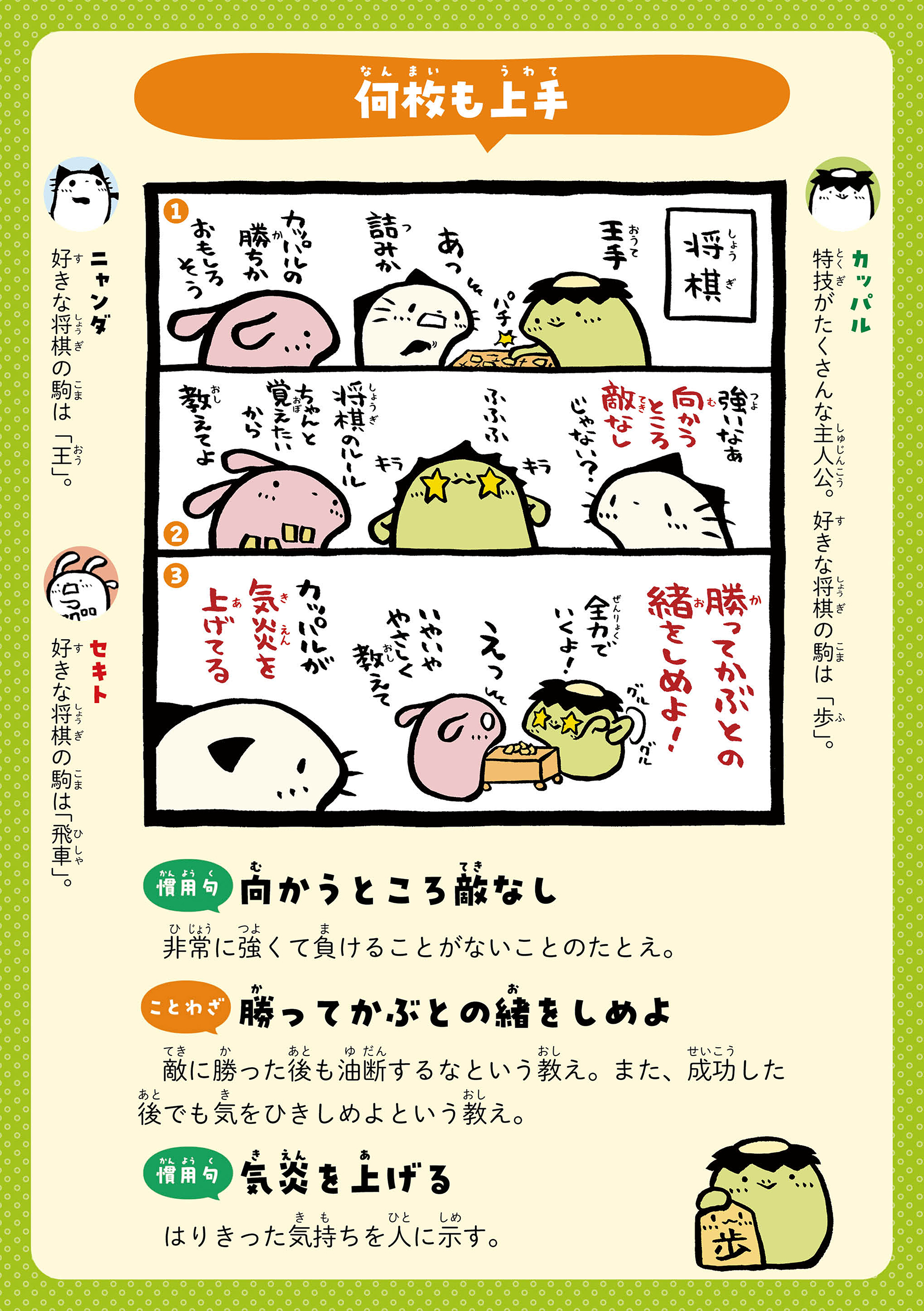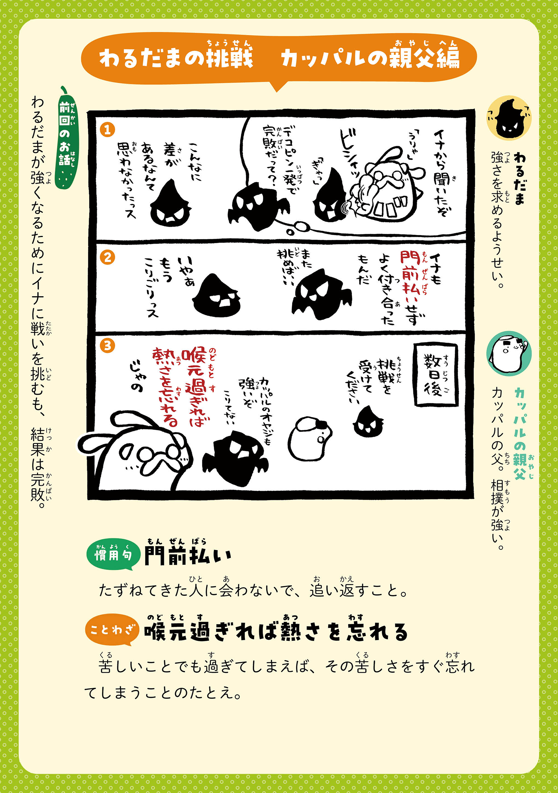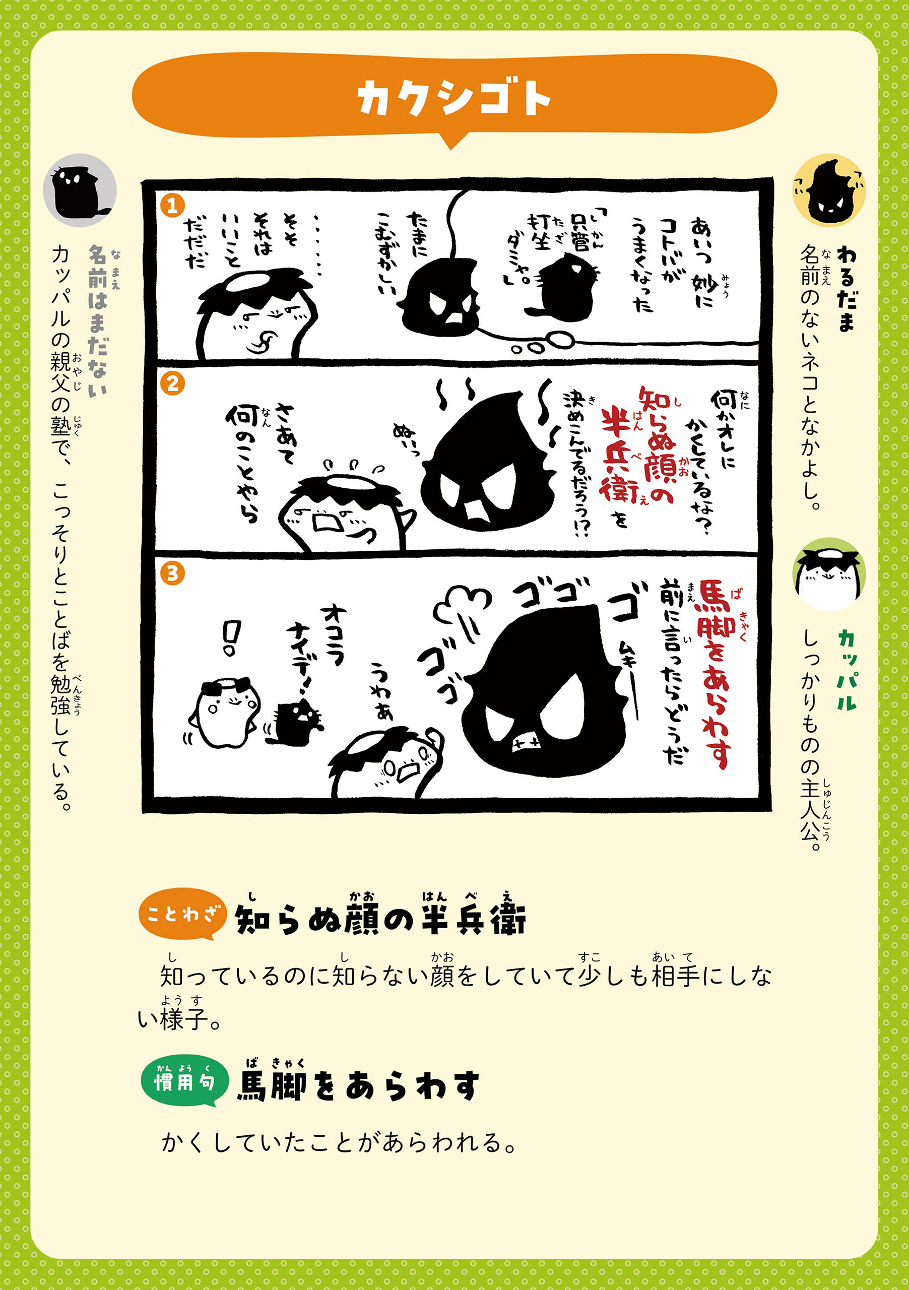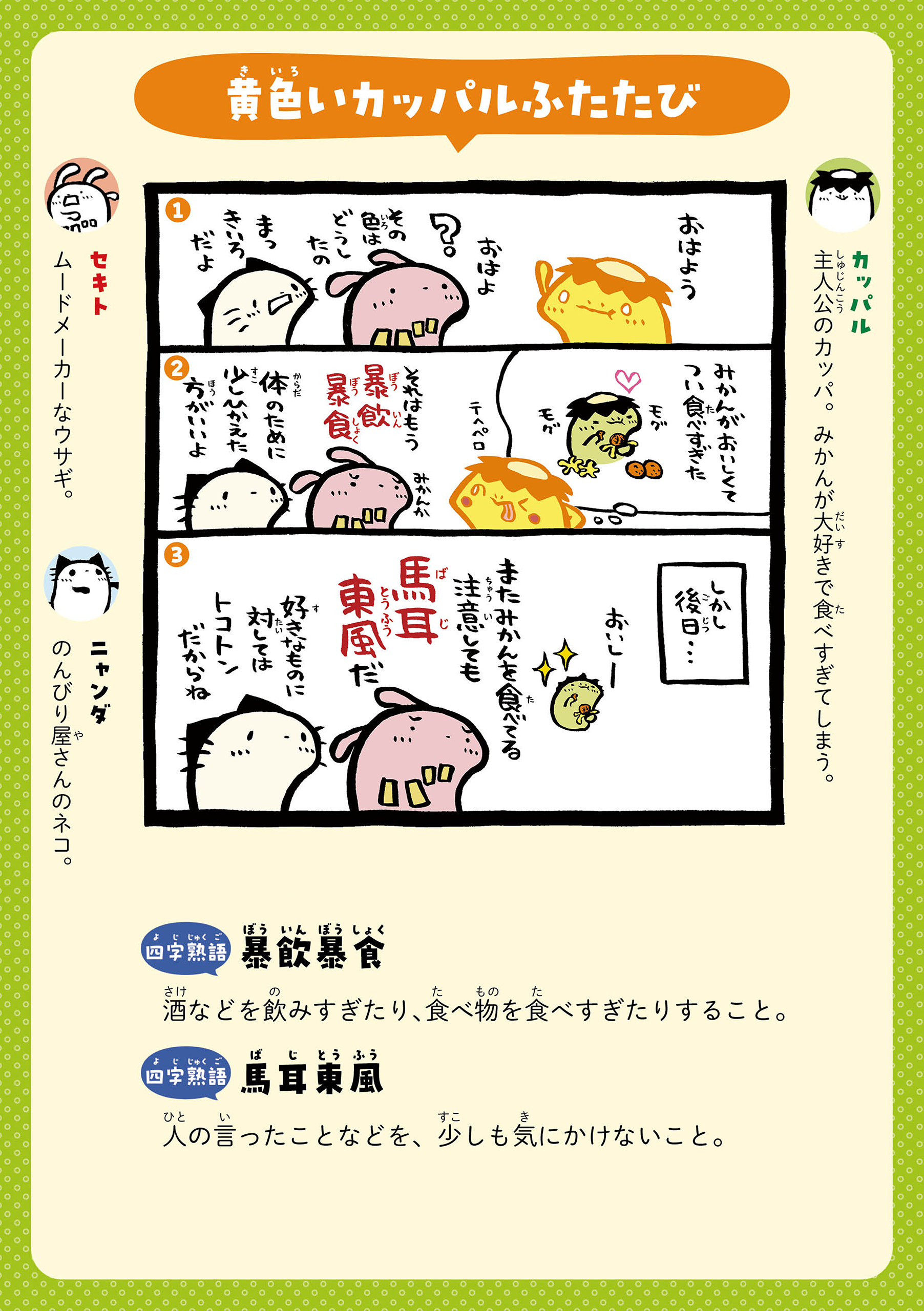 カッパルたちとことばであそぼう! 主人公のカッパの男の子・カッパルと個性的な仲間たちの日常を通して、ことわざや慣用句などの言葉を楽しく学べる連載です。毎週月・木に更新! 書籍『まんがでことわざ・慣用句 カッパルとことばであそぼう』好評発売中! https://hon.gakken.jp/book/1020609800 参考書籍:「新レインボー小学ことわざ・四字熟語辞典 改訂第2版 (オールカラー)」(Gakken)