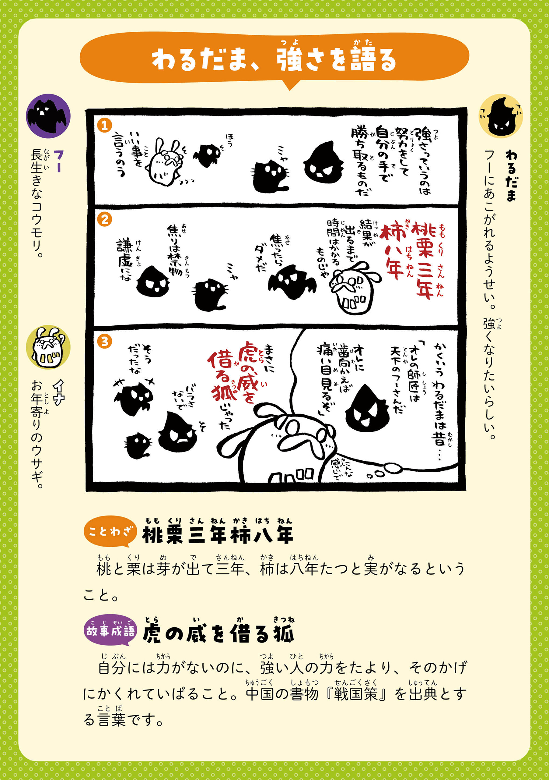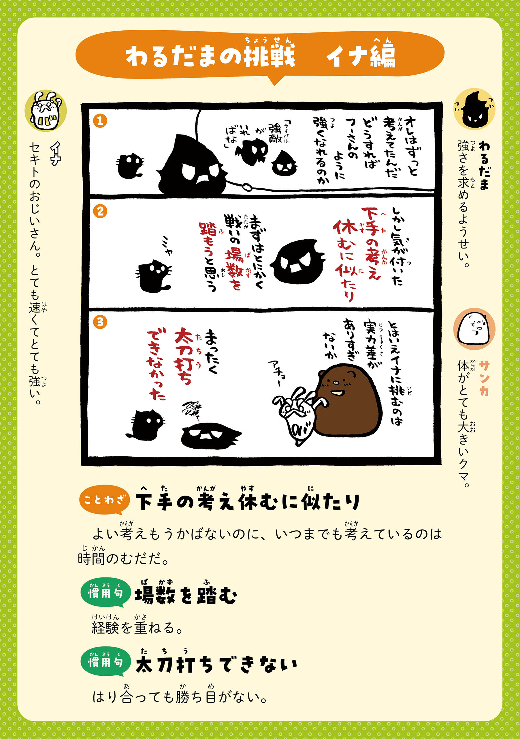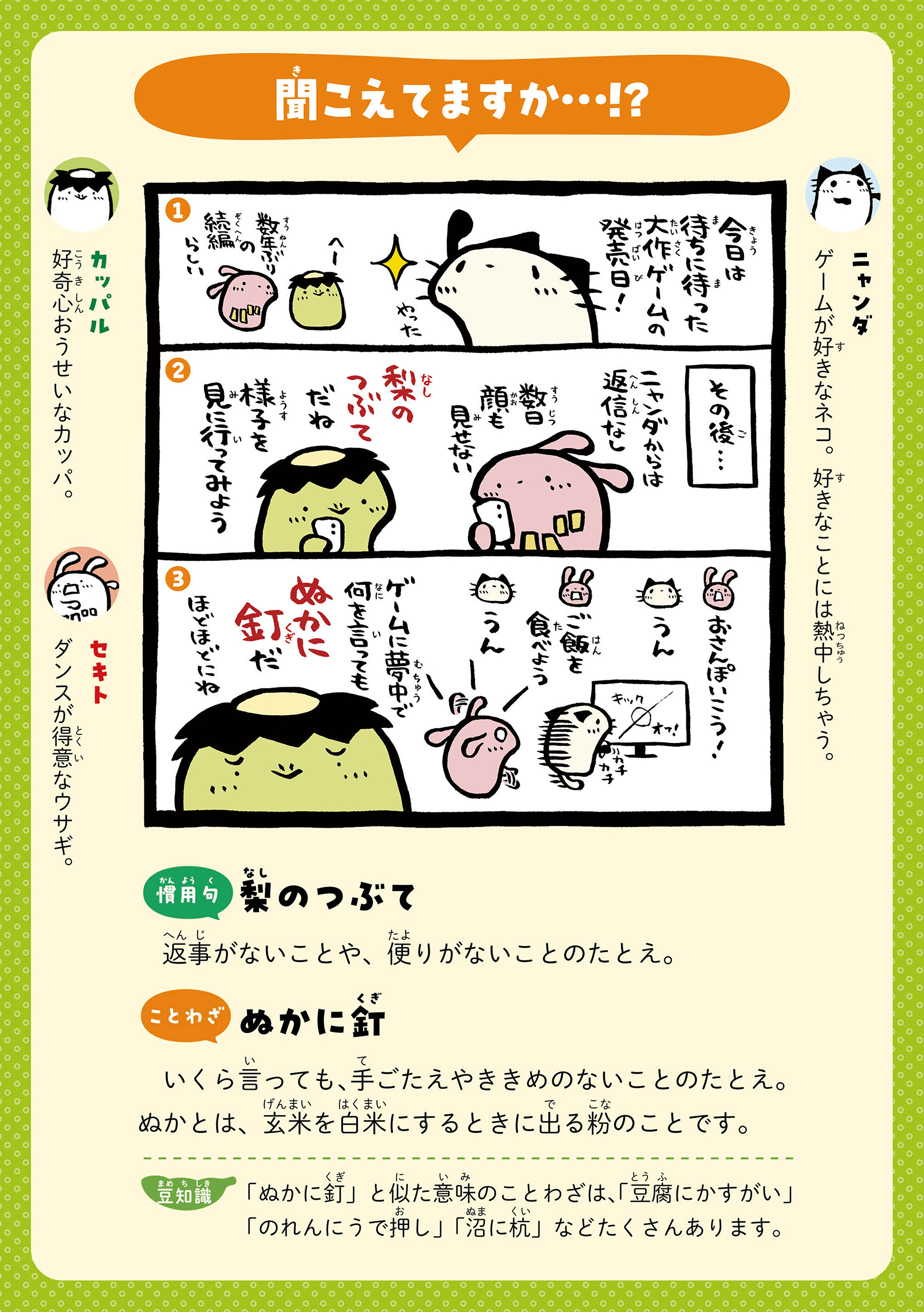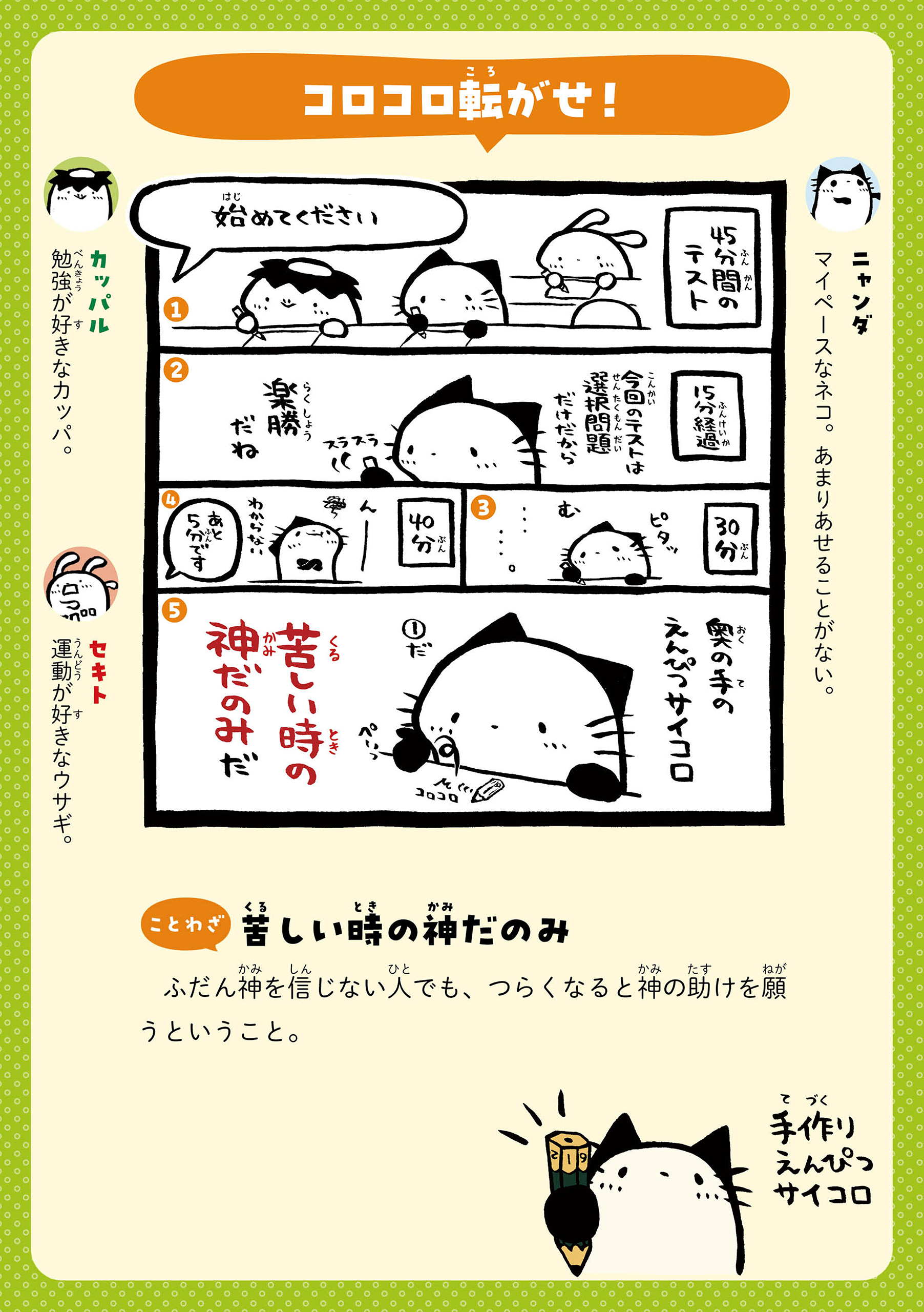 カッパルたちとことばであそぼう! 主人公のカッパの男の子・カッパルと個性的な仲間たちの日常を通して、ことわざや慣用句などの言葉を楽しく学べる連載です。毎週月・木に更新! 書籍『まんがでことわざ・慣用句 カッパルとことばであそぼう』好評発売中! https://hon.gakken.jp/book/1020609800 参考書籍:「新レインボー小学ことわざ・四字熟語辞典 改訂第2版 (オールカラー)」(Gakken)