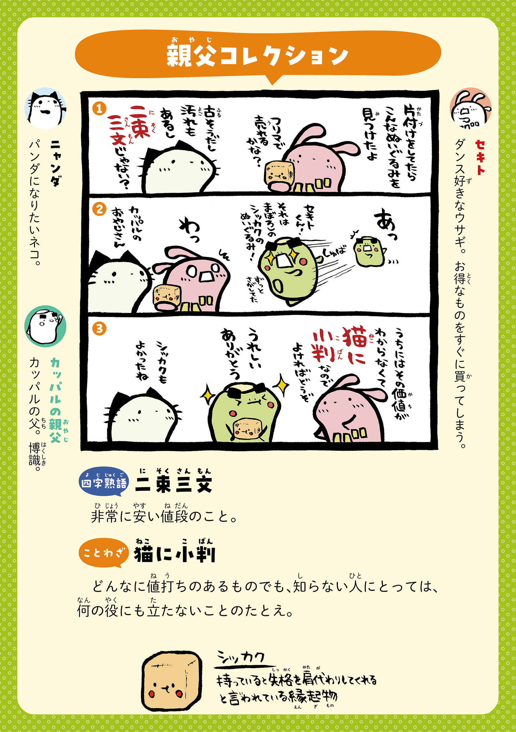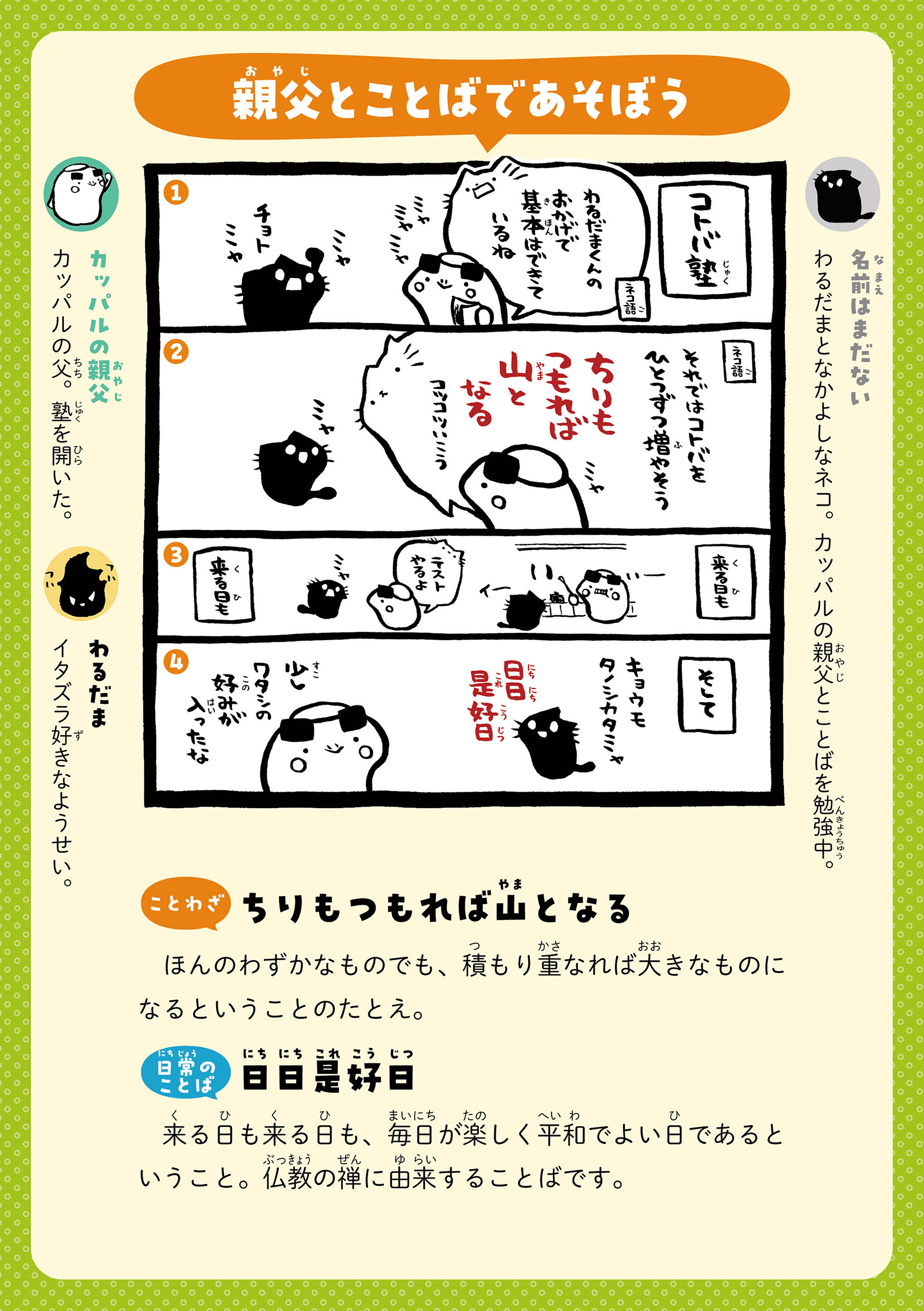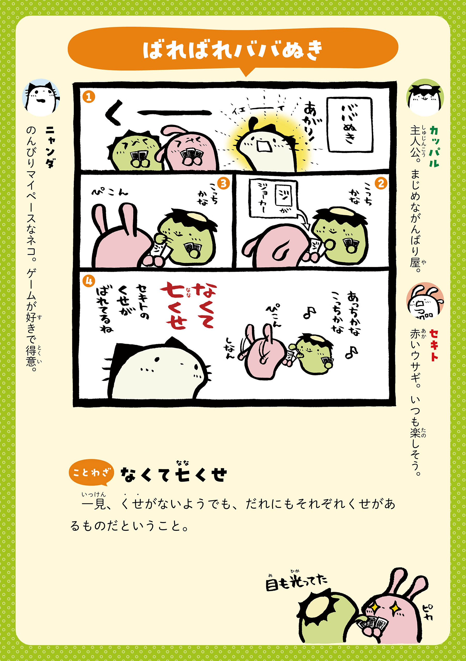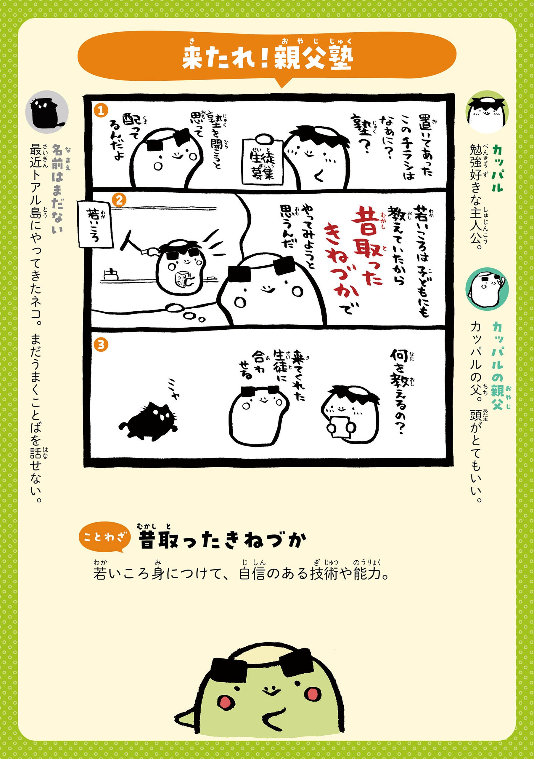 カッパルたちとことばであそぼう! 主人公のカッパの男の子・カッパルと個性的な仲間たちの日常を通して、ことわざや慣用句などの言葉を楽しく学べる連載です。毎週月・木に更新! 参考書籍:「新レインボー小学ことわざ・四字熟語辞典 改訂第2版 (オールカラー)」(Gakken)