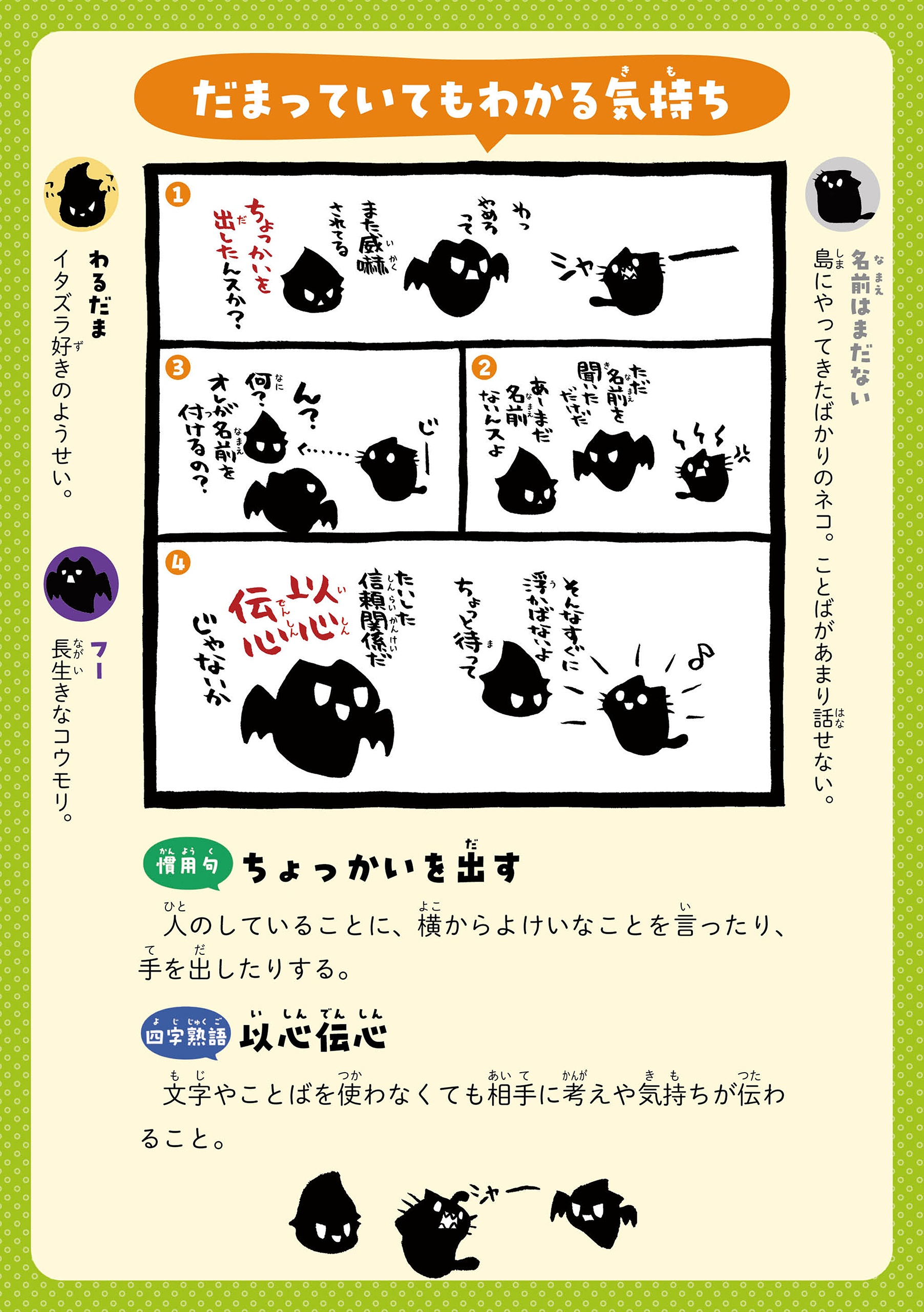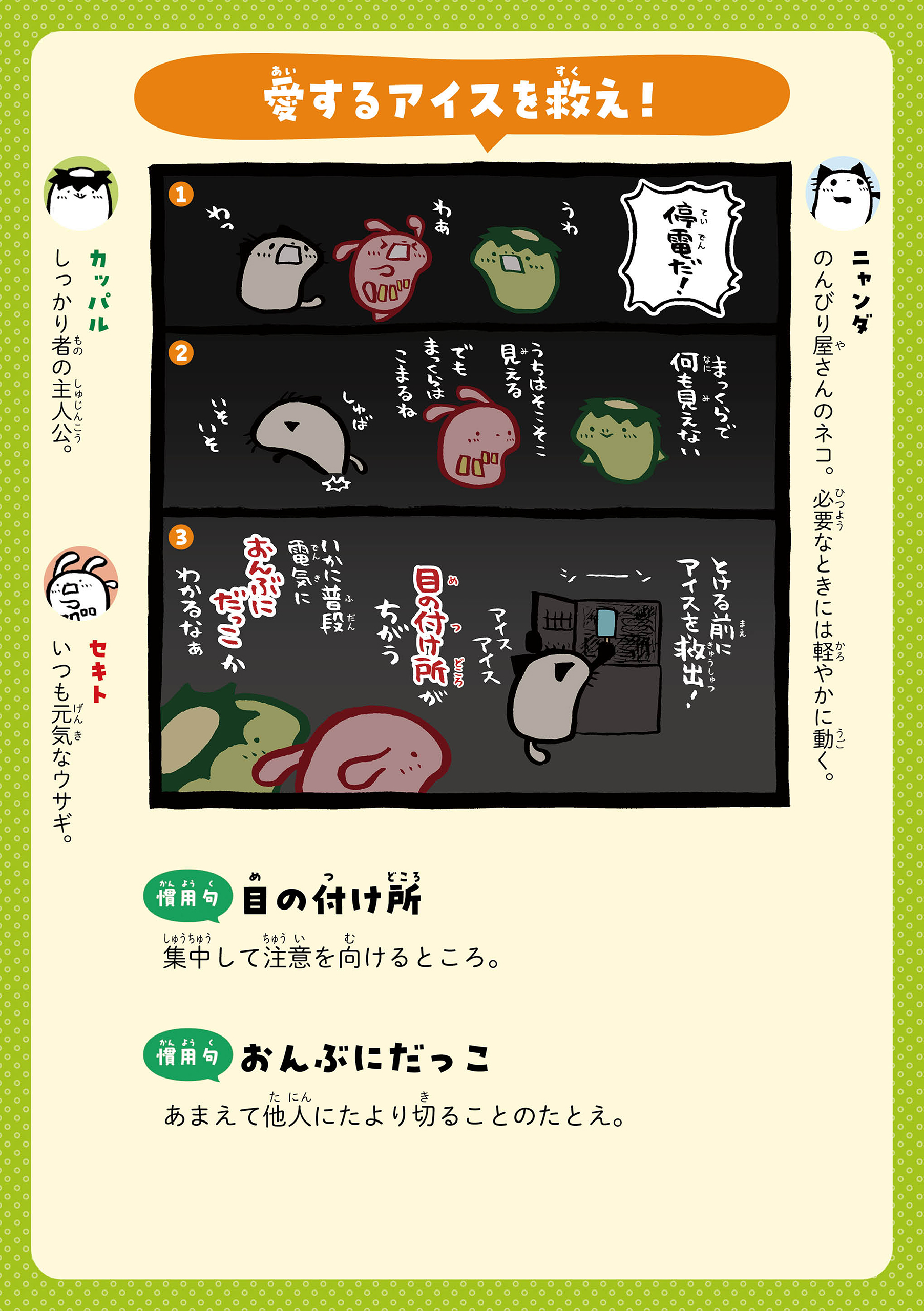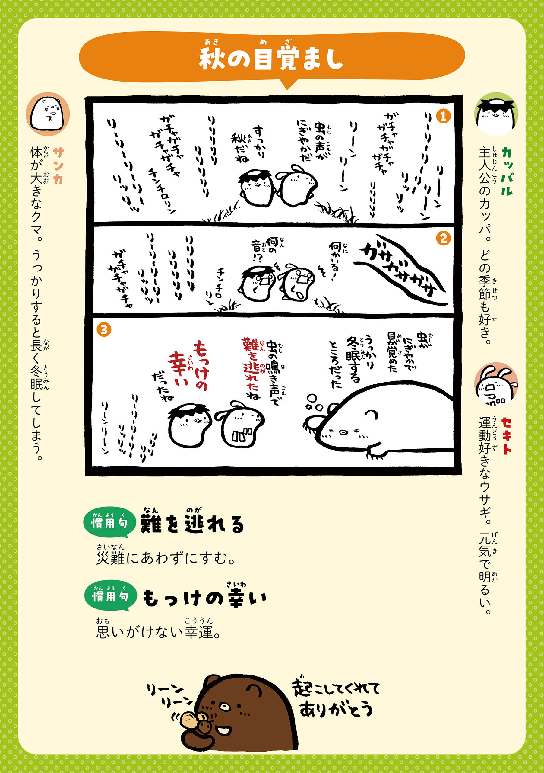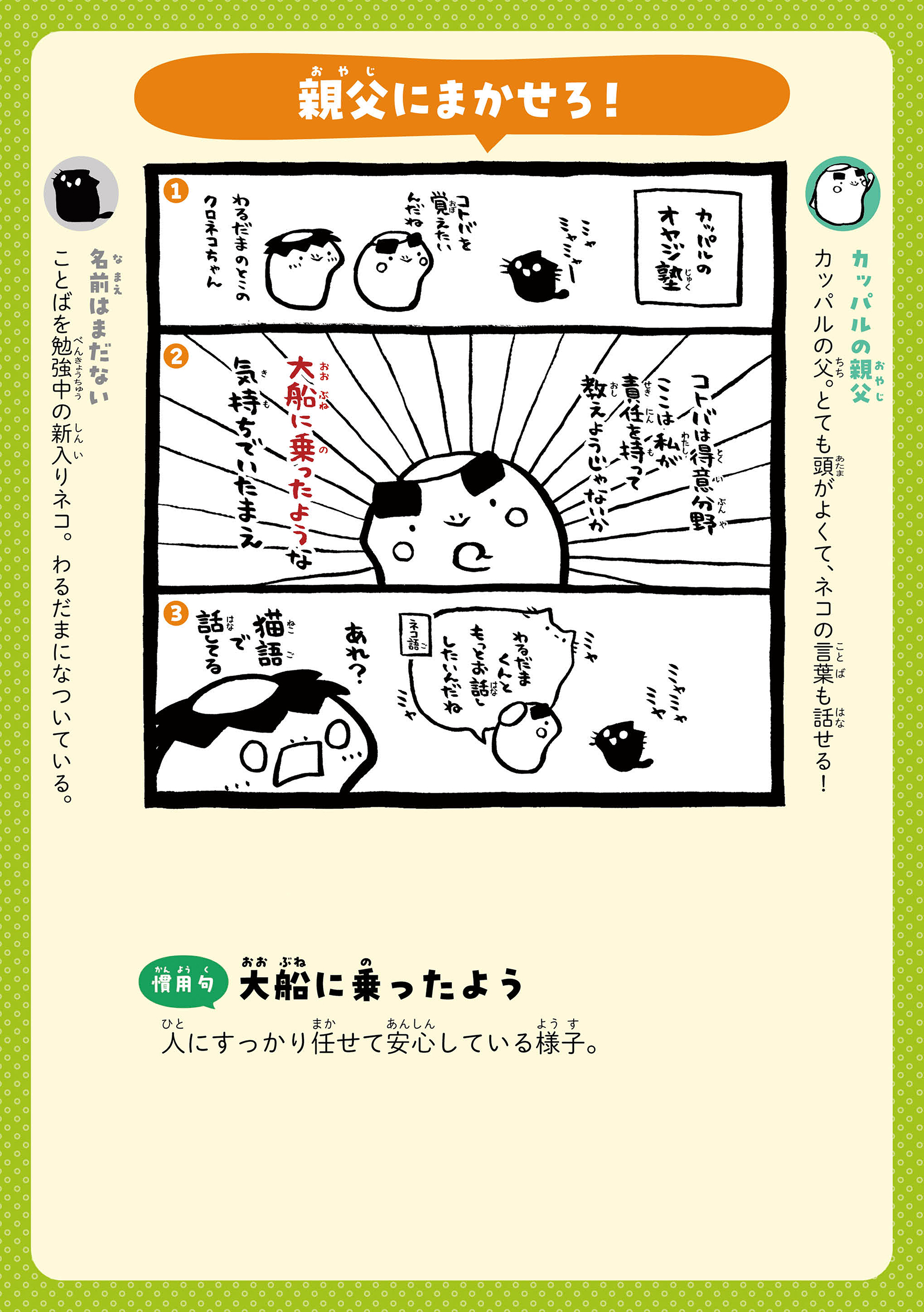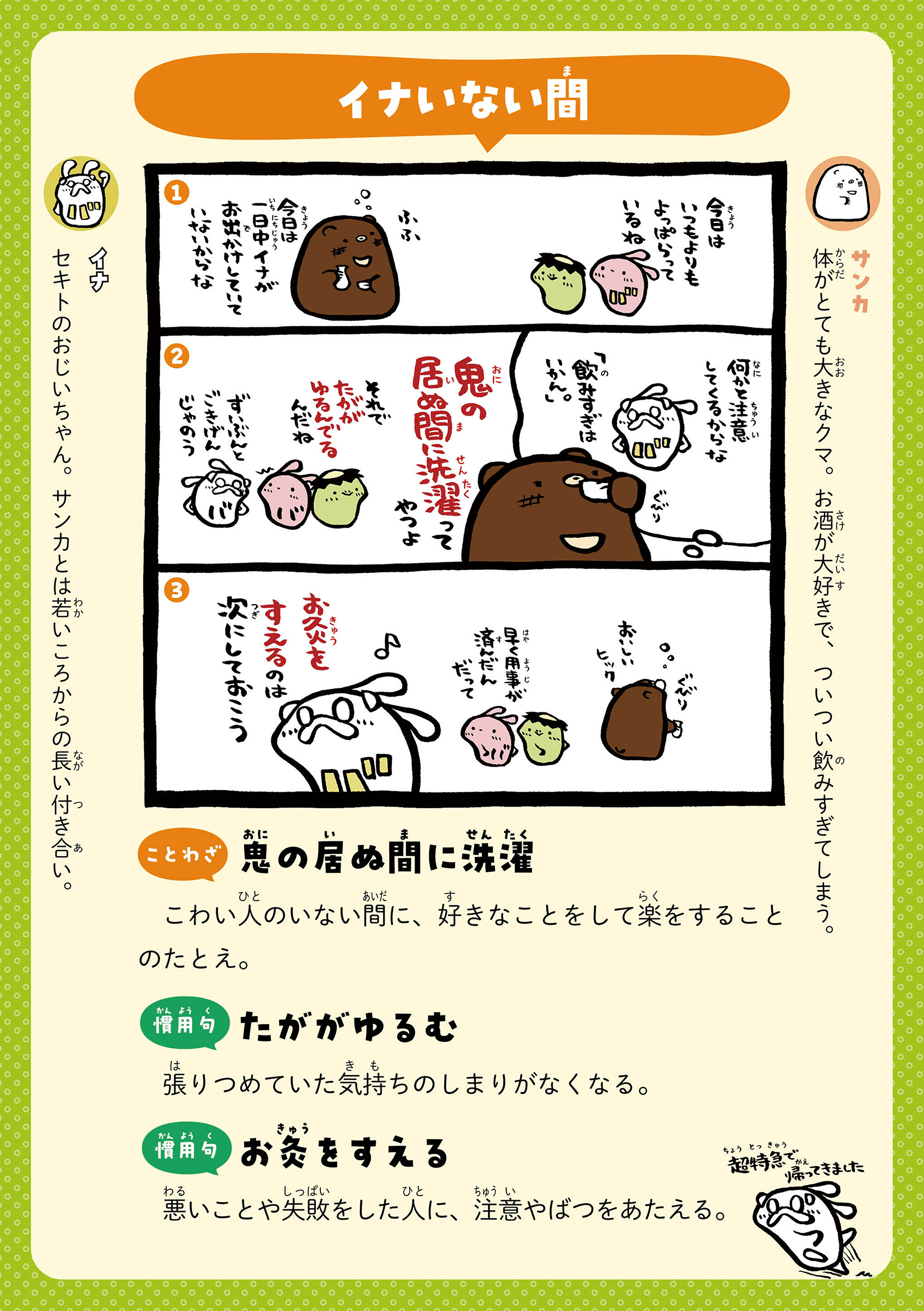 カッパルたちとことばであそぼう! 主人公のカッパの男の子・カッパルと個性的な仲間たちの日常を通して、ことわざや慣用句などの言葉を楽しく学べる連載です。毎週月・木に更新! 参考書籍:「新レインボー小学ことわざ・四字熟語辞典 改訂第2版 (オールカラー)」(Gakken)