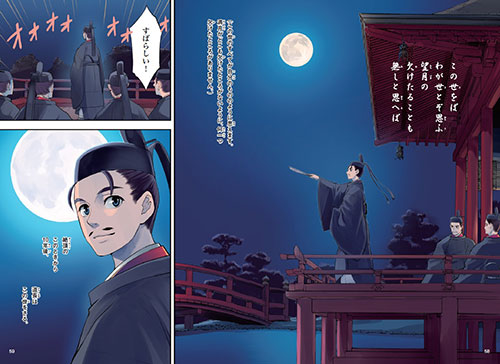 満月の夜に、月明かりに照らされながら和歌を詠む藤原道長。満足げな表情もとっても美しいね。藤原氏の繁栄だけじゃなくて、日本の貴族文化が最高潮に達した場面って言えるんじゃないかな。