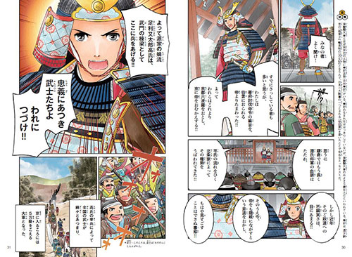 鎌倉幕府に反旗をひるがえして、源氏の棟梁として立ち上がった足利尊氏さん。武士たちに奮起をうながす演説が、すごい迫力!みんなの心をひとつにしたんだよ。武者姿もすごくカッコイイね!