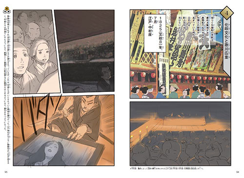 江戸の華やかな化政文化を表現したひとコマと、『東海道四谷怪談』のおどろおどろしく緊張感のあるシーンが、実際に観客になって江戸で舞台を観ているような気分だよ~!