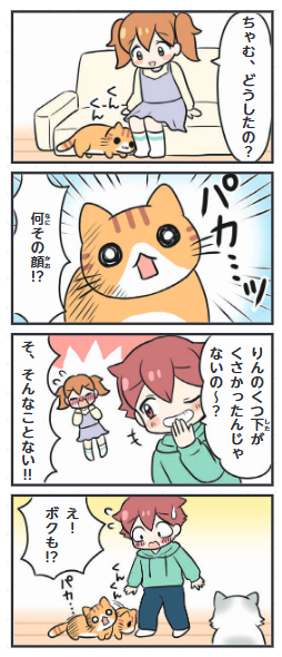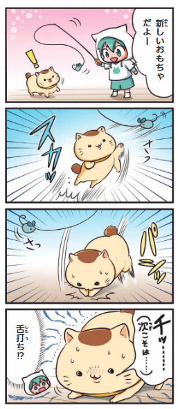 ここからは、「ねこ語」クイズに挑戦してみましょう! 4コマまんがをヒントに考えてみてください。