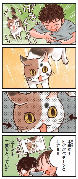 ヒゲはねこにとって大事なセンサー。だから非常事態は守ろうとして、ヒゲを顔にぺったりはりつけるように後ろに引くんだそう。他のねことのケンカのような、ねこにとって、こわいことがあったときにこの表情が見られます。急に大きな音がしておどろいたときに、いっしゅんヒゲを引くことも。