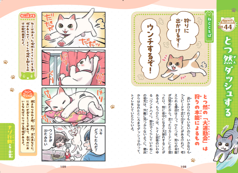 「鳴き声」「表情&姿勢」「しぐさ」「ナゾ行動」ごとの4コマまんがが満載で、楽しくねこのことばと気持ちがわかるから、ねこへの理解が深まって、ねこにも好かれること間違いなし。