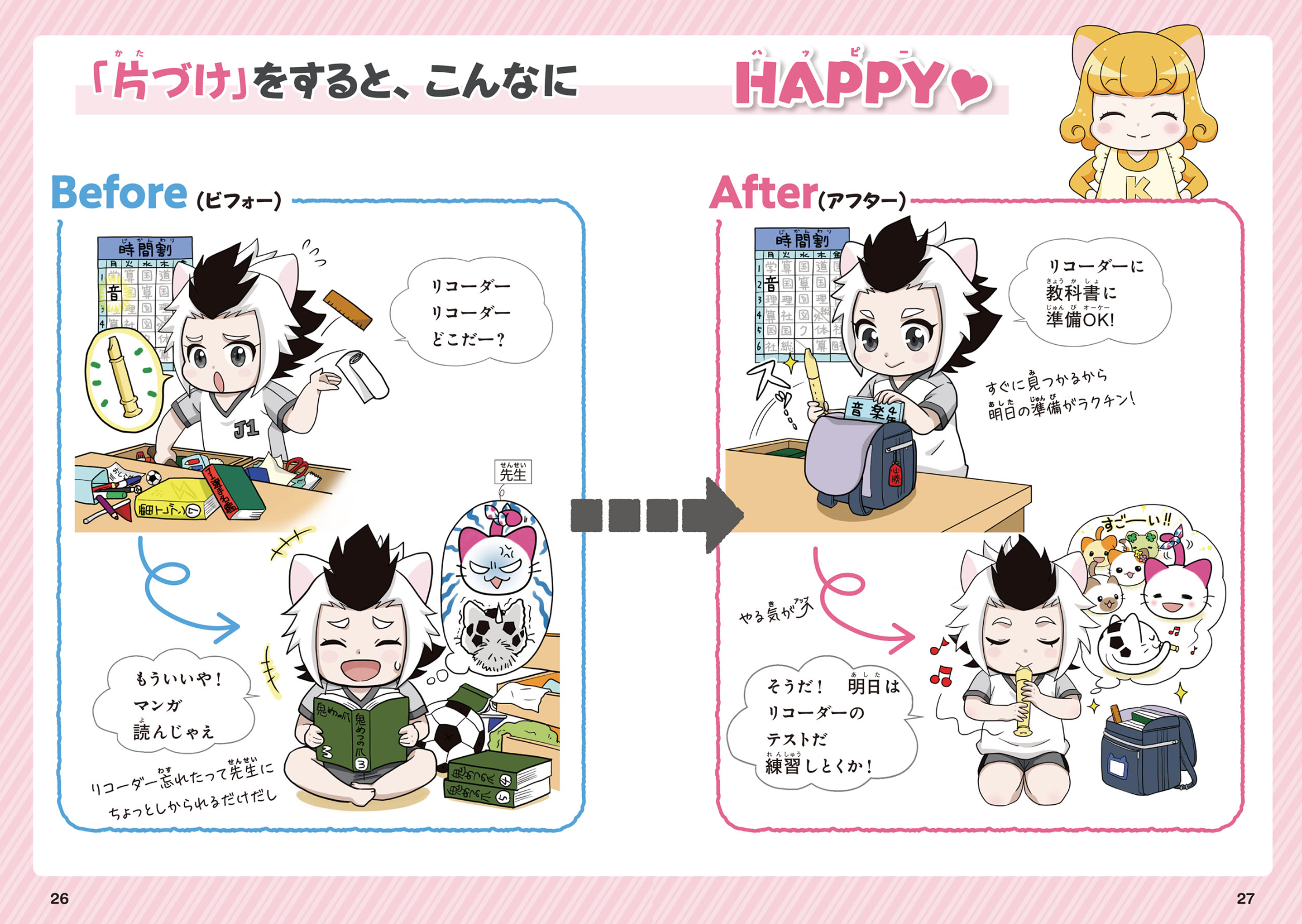 片づけが苦手な猫のキャラクター「みけ」と、その双子の弟で片づけ上手な「クッキー」が登場するマンガ仕立てのストーリーで、楽しく片づけのコツを学べます。ギャグ満載の内容で、思わず笑ってしまう場面も……。