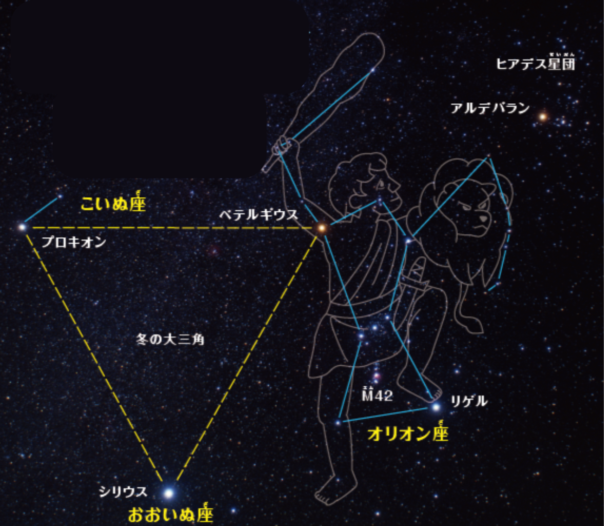 下記のイラストと冬の夜空のベテルギウスを照らし合わせて見てください。そうすれば、おおいぬ座のシリウス、こいぬ座のプロキオンも見つかり、線で結ぶと正三角形に近い形になります。これが冬の大三角です。